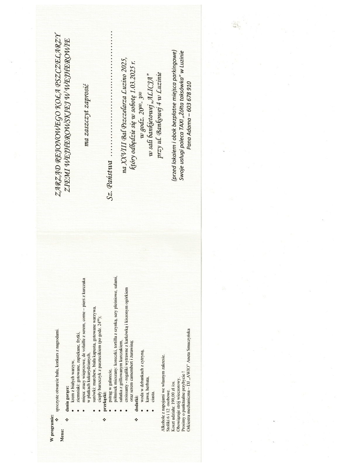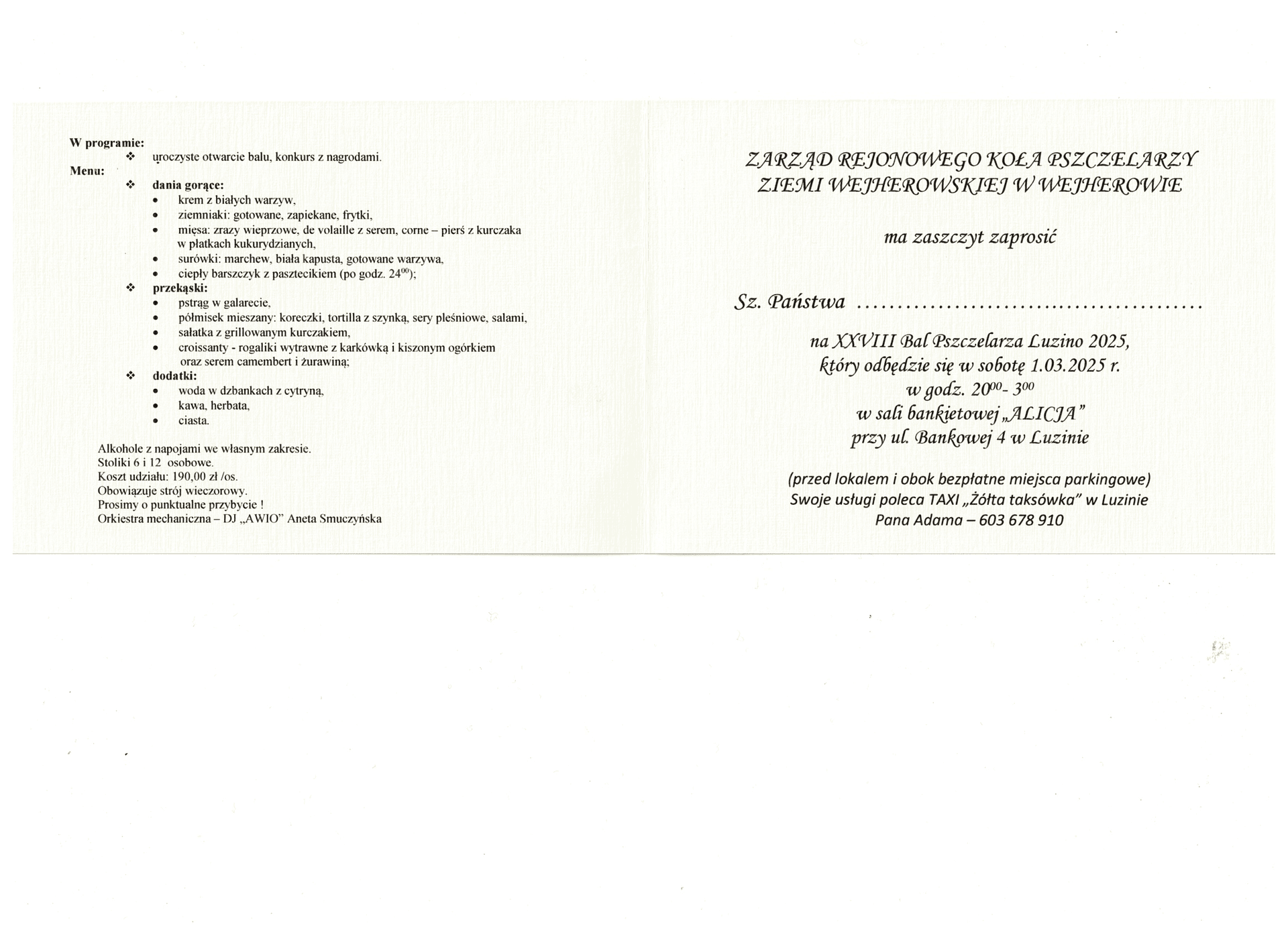 Zarząd RKP Ziemi Wejherowskiej  w Wejherowie ma zaszczyt zaprosić wszystkich chętnych pszczelarzy wraz z rodzinami i znajomymi na tradycyjny już 28 Bal Pszczelarza.