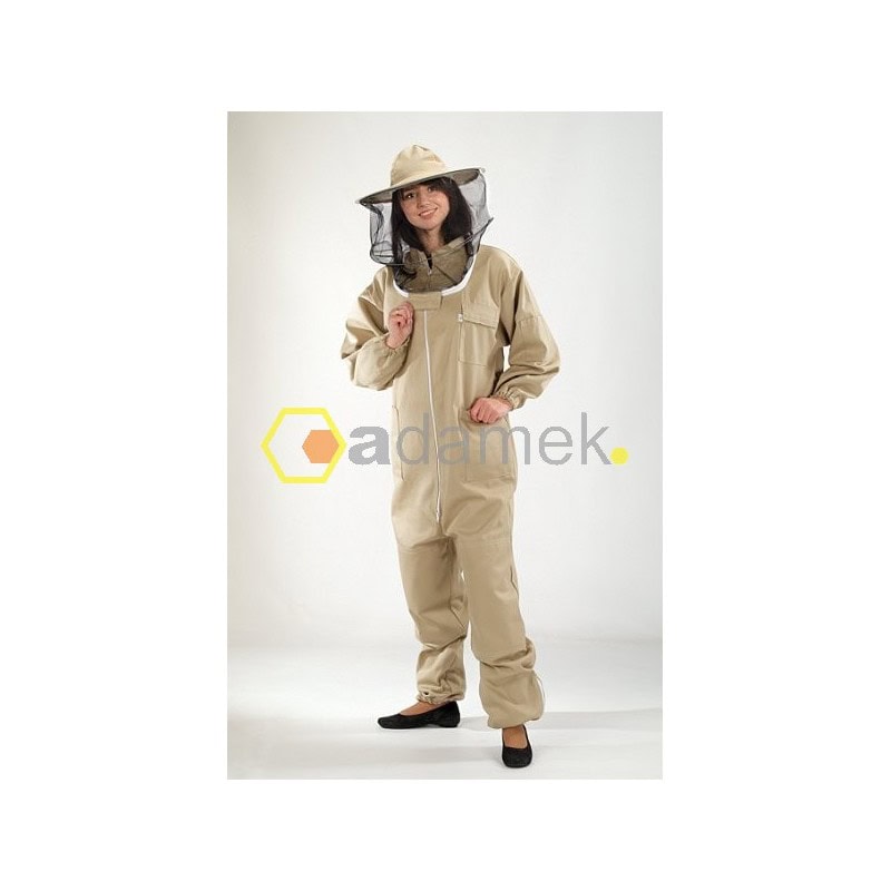 Kombinezon pszczelarski z suwakiem i kołnierzem typu stójka, wyposażony w odpinany kapelusz. Tylny pas posiada elastyczną gumkę, a rękawy i nogawki zakończone są ściągaczami dla lepszego dopasowania. Nogawki z boku mają suwaki, ułatwiające zakładanie i zdejmowanie. Posiada dwie duże kieszenie, jedną małą oraz praktyczny wpust na dłuto. Wykonany w 100% z bawełny.