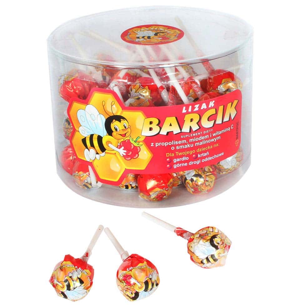 Lizaki Barcik o smaku malinowym z dodatkiem propolisu, miodu i witaminy C to smaczny sposób na wsparcie codziennej diety. Witamina C przyczynia się do prawidłowego funkcjonowania układu odpornościowego oraz nerwowego, a zawartość tej witaminy w jednym lizaku odpowiada 25% referencyjnej wartości spożycia.