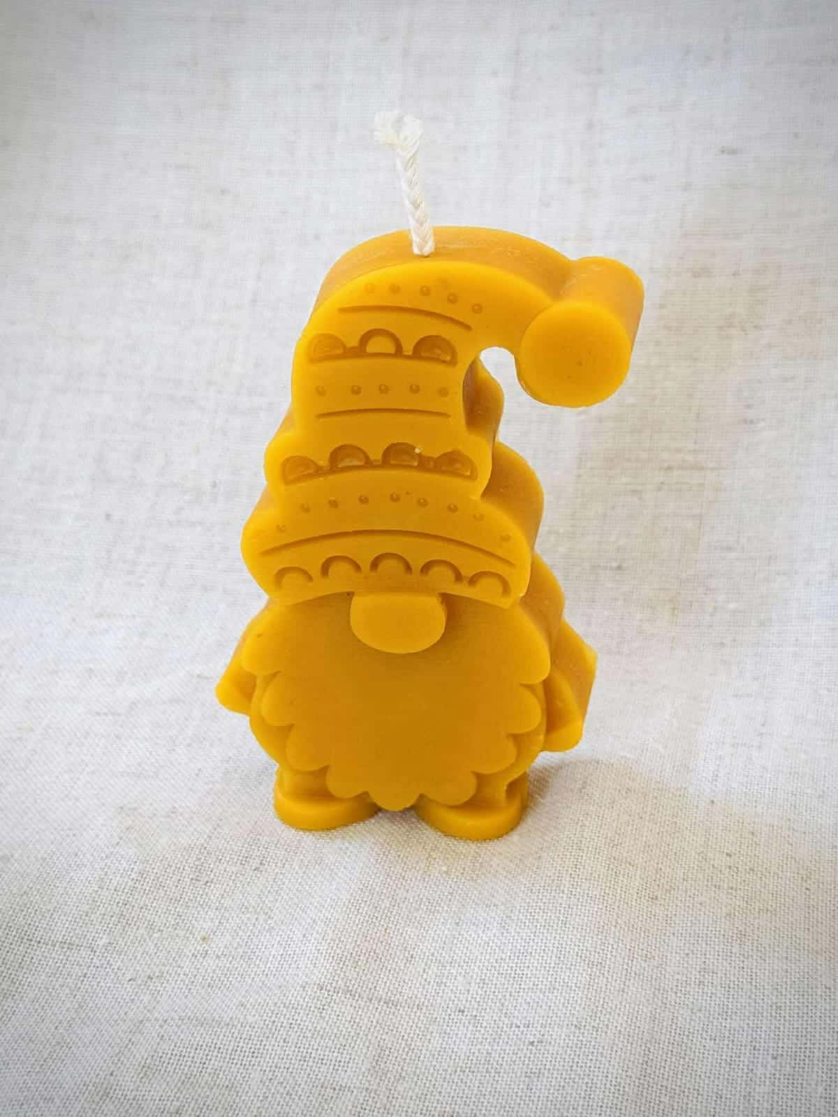 • Opis: Świeca z wosku pszczelego przedstawiająca postać skrzata w mikołajkowej czapce.